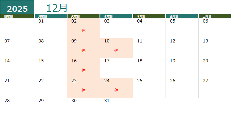 12月は、毎週火曜日・10日(水)・24日(水)がお休みとなります。