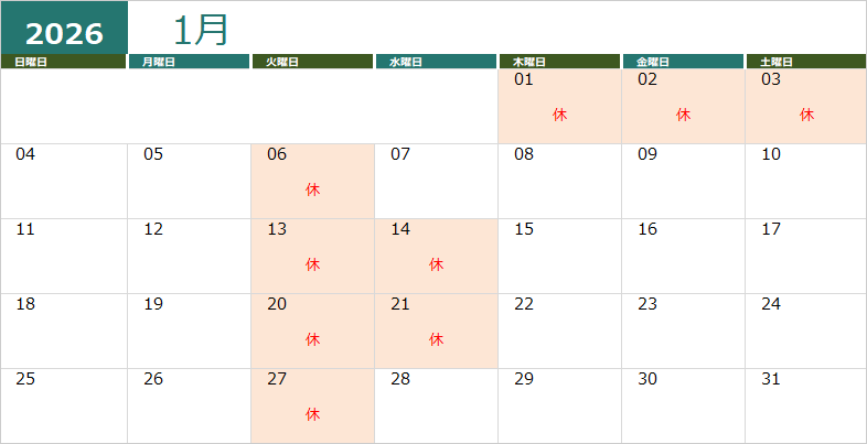 1月は、毎週火曜日・1日(木)・2日(金)・3日(土)・14日(水)・21日(水)がお休みとなります。